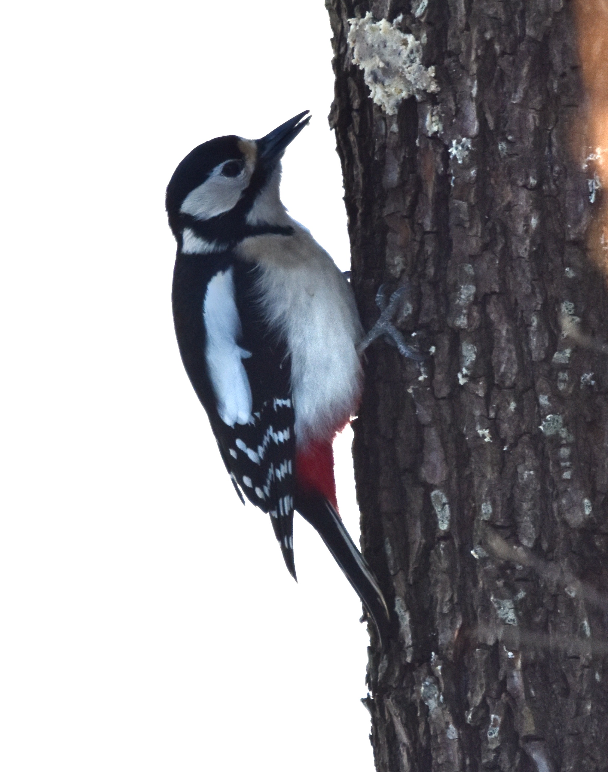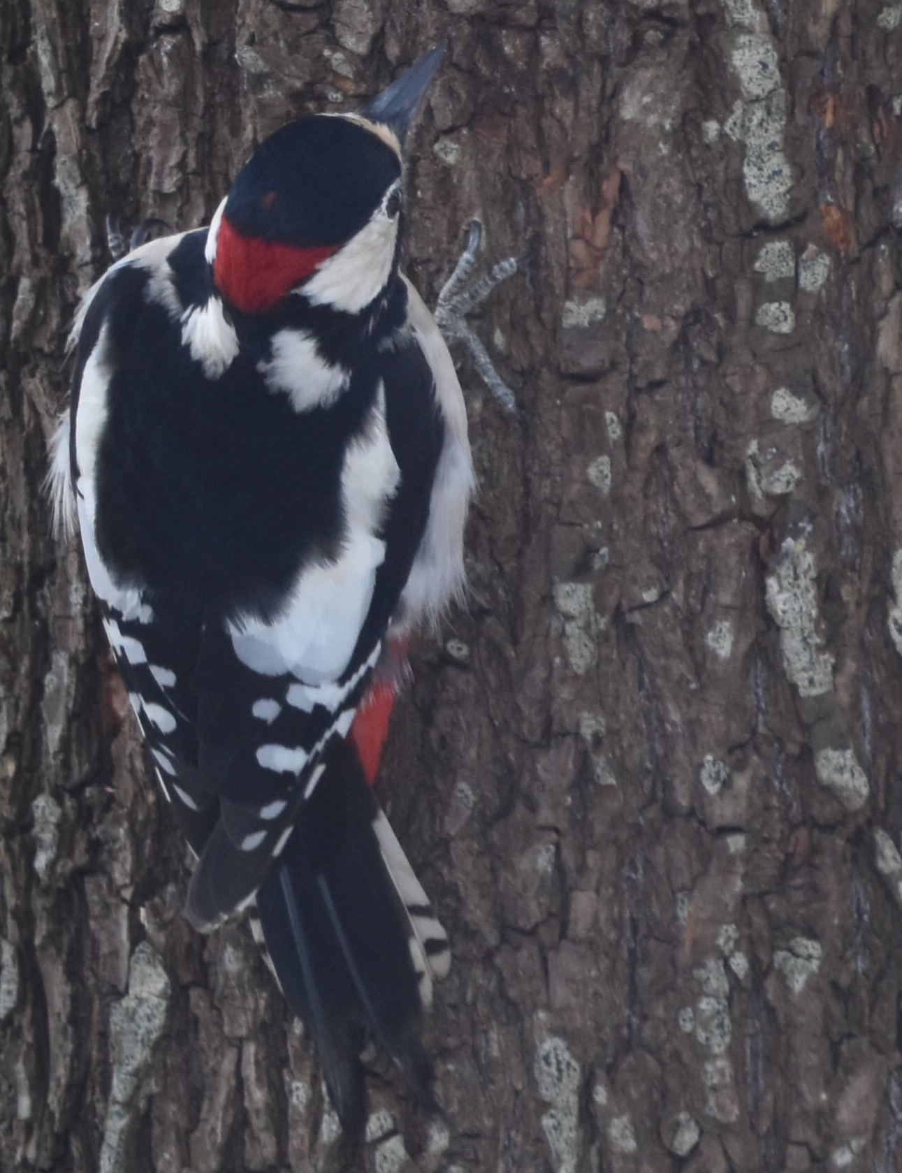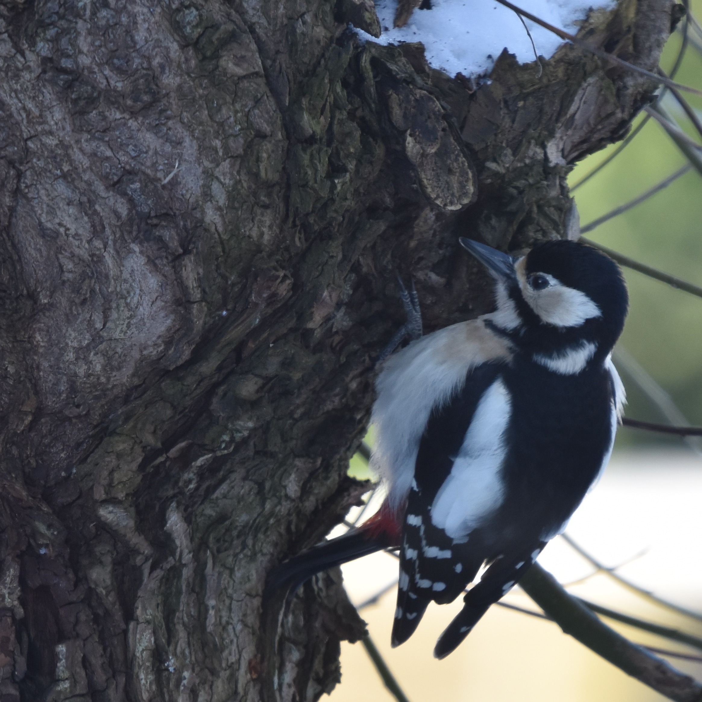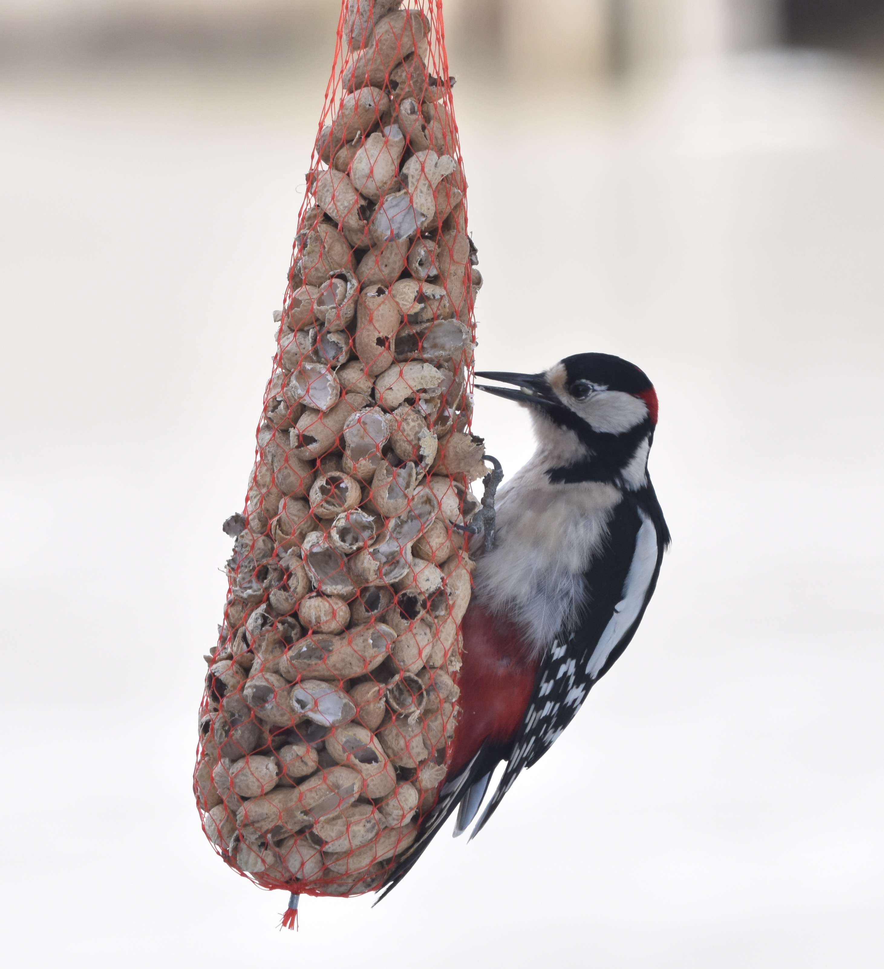 Al mijn bosexcursies bieden weinig ontmoetingen met vogels. Gelukkig weten ze, zeker als de vorst invalt, wel de vetbollen, zonnepitten, fruitresten en pinda’s in mijn tuin te vinden. Het levert mooie plaatjes van diverse vogels op. Regelmatig maakt het mannetje van de Grote Bonte Specht zijn opwachting. De vogel onderscheidt zich van een vrouwtje doordat zij geen rood achterhoofd heeft. Het is dan ook een mooie verrassing als ook zij op een gegeven moment verschijnt.